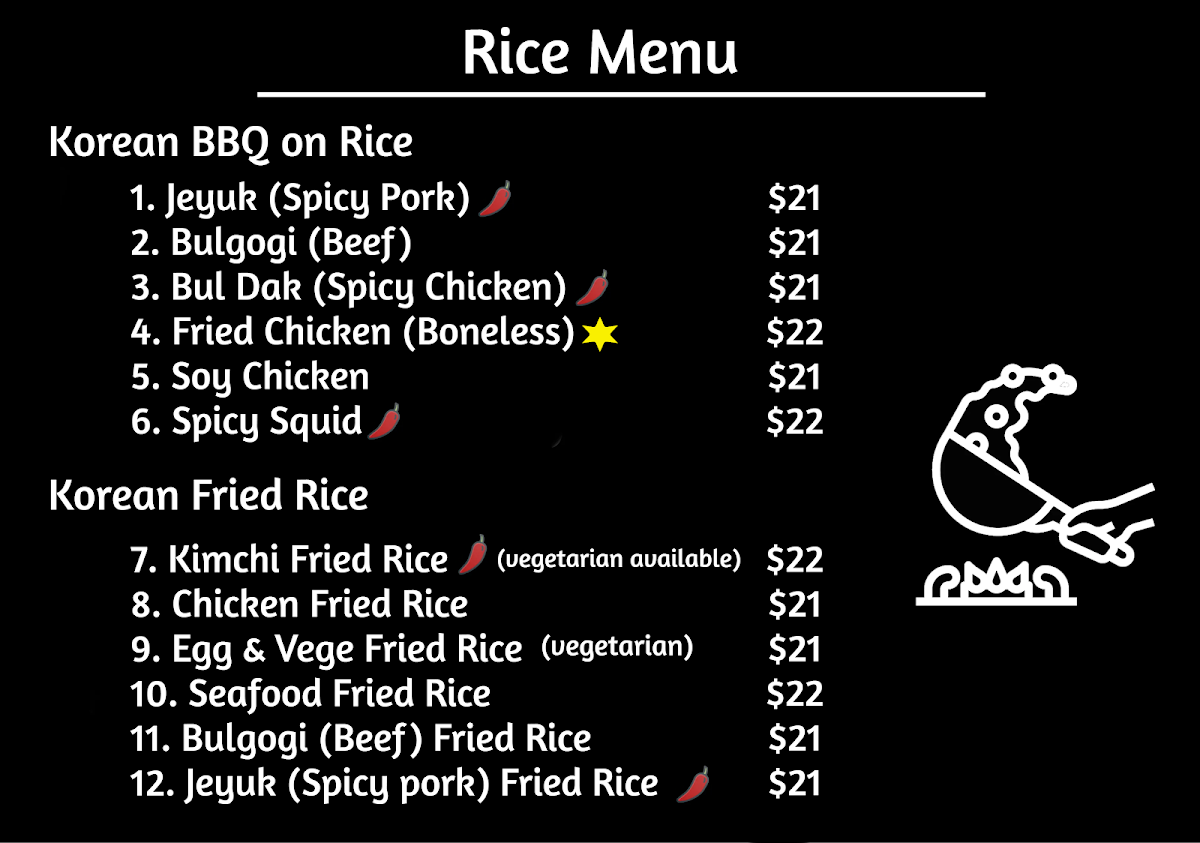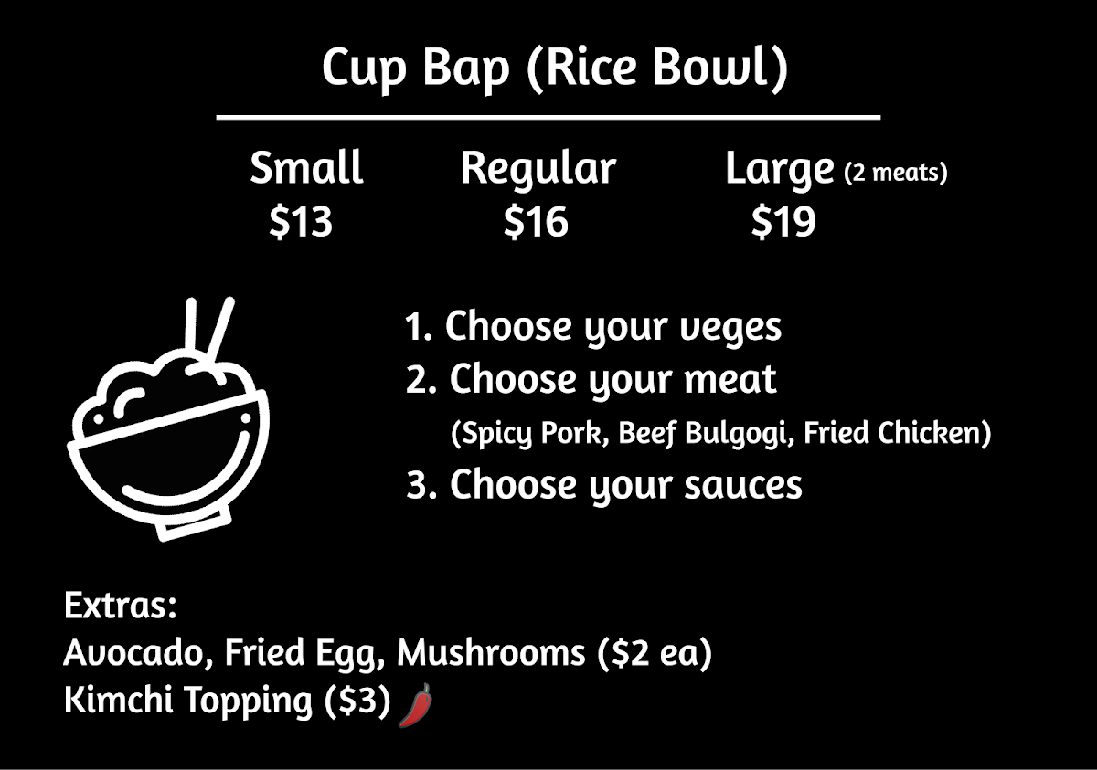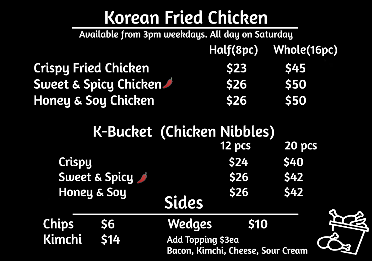 The menu at Ko Kai offers a delightful variety of Korean-inspired dishes with something for everyone. Their Cup Bap options come in three sizes: Small, Regular, and Large, and include a range of Korean BBQ on rice options like Jeyuk (Spicy Pork), Bulgogi (Beef), Fried Chicken (Boneless), Buldak (Spicy Chicken), and Soy Chicken. The Korean Fried Rice section is equally diverse, featuring Kimchi Fried Rice, Chicken Fried Rice, Egg & Vege Fried Rice, Seafood Fried Rice, and Bulgogi (Beef) Fried Rice. For those craving something crispy, the Korean Fried Chicken is available from 3pm on weekdays and all day Saturday, with options like Crispy Fried Chicken (HALF or WHOLE), Sweet & Spicy Chicken (HALF or WHOLE), and Honey & Soy Chicken (HALF). To complement your meal, extras such as Korean Hotdog - Sausage, Korean Hotdog - Mozzarella, and Kimchi are available. The variety and bold flavors make for a satisfying dining experience at Ko Kai.